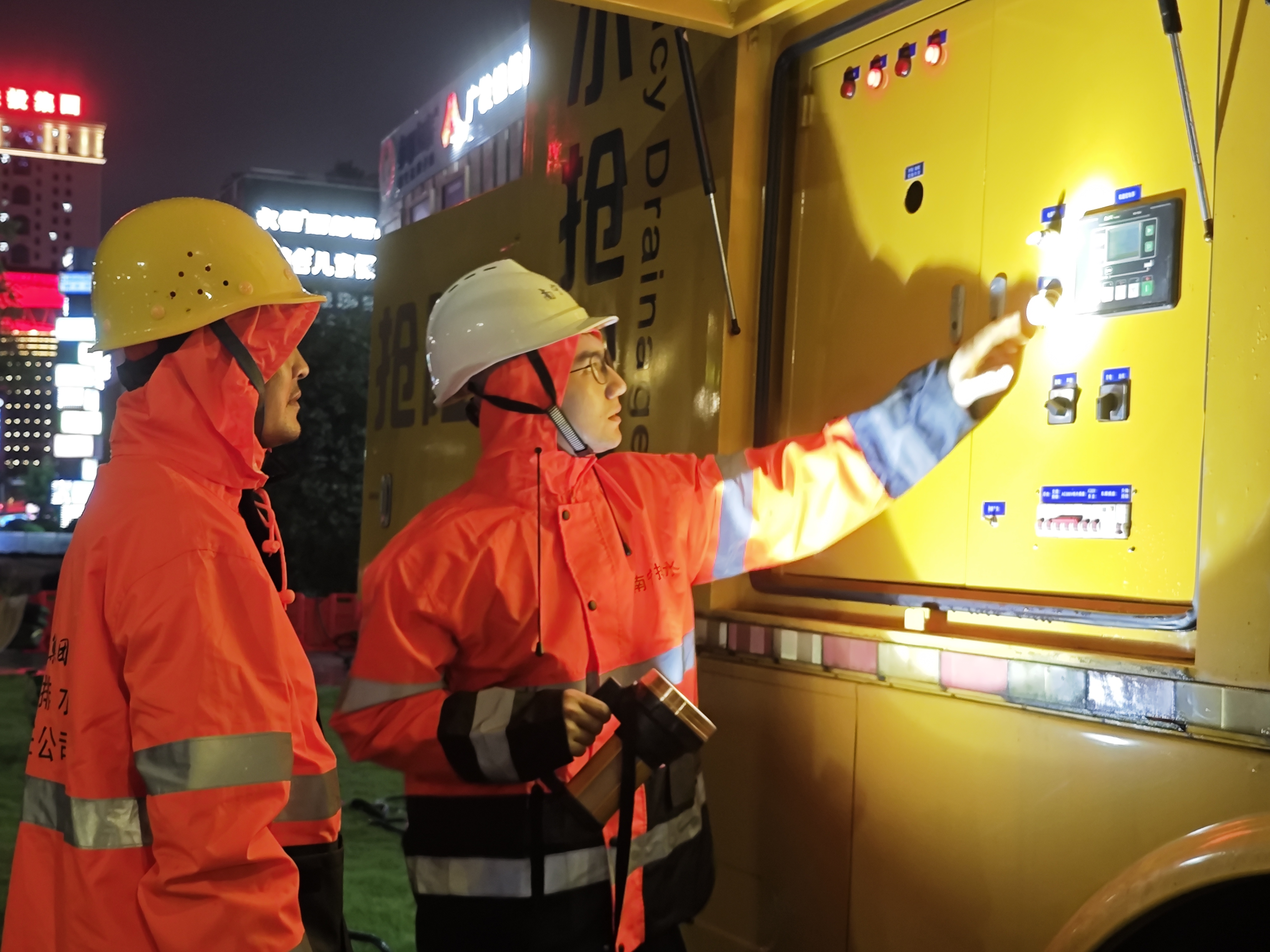 工作人員操作排水搶險車(chē)輛進(jìn)行抽排處置