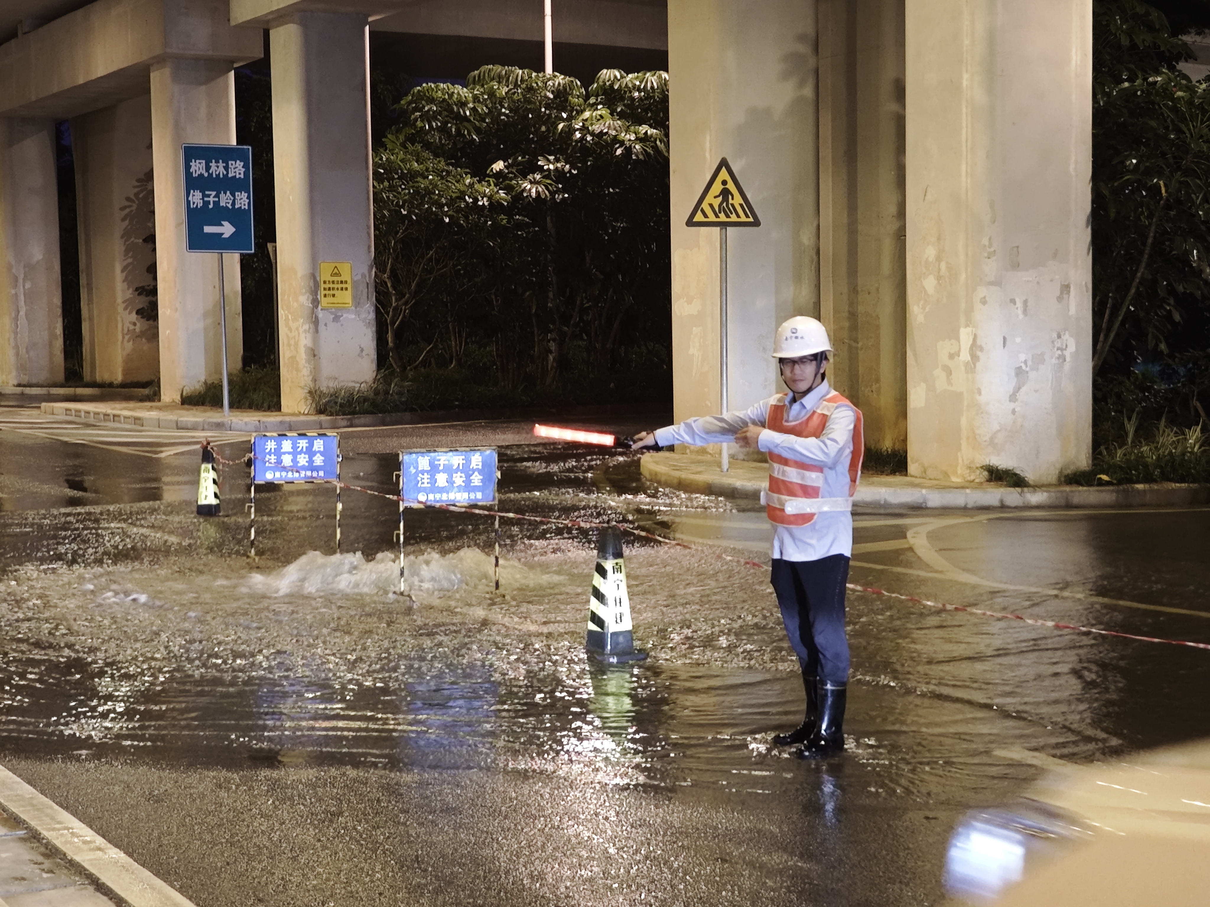 市排水公司工作人員在鳳嶺北路楓林路口引導車(chē)輛有序通行
